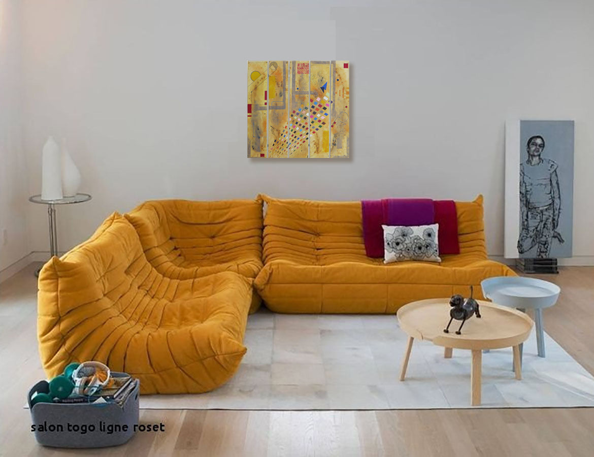 - Acrylique / toiles (Polyptyque : 5 toiles reliées par une baguette en alu brillant